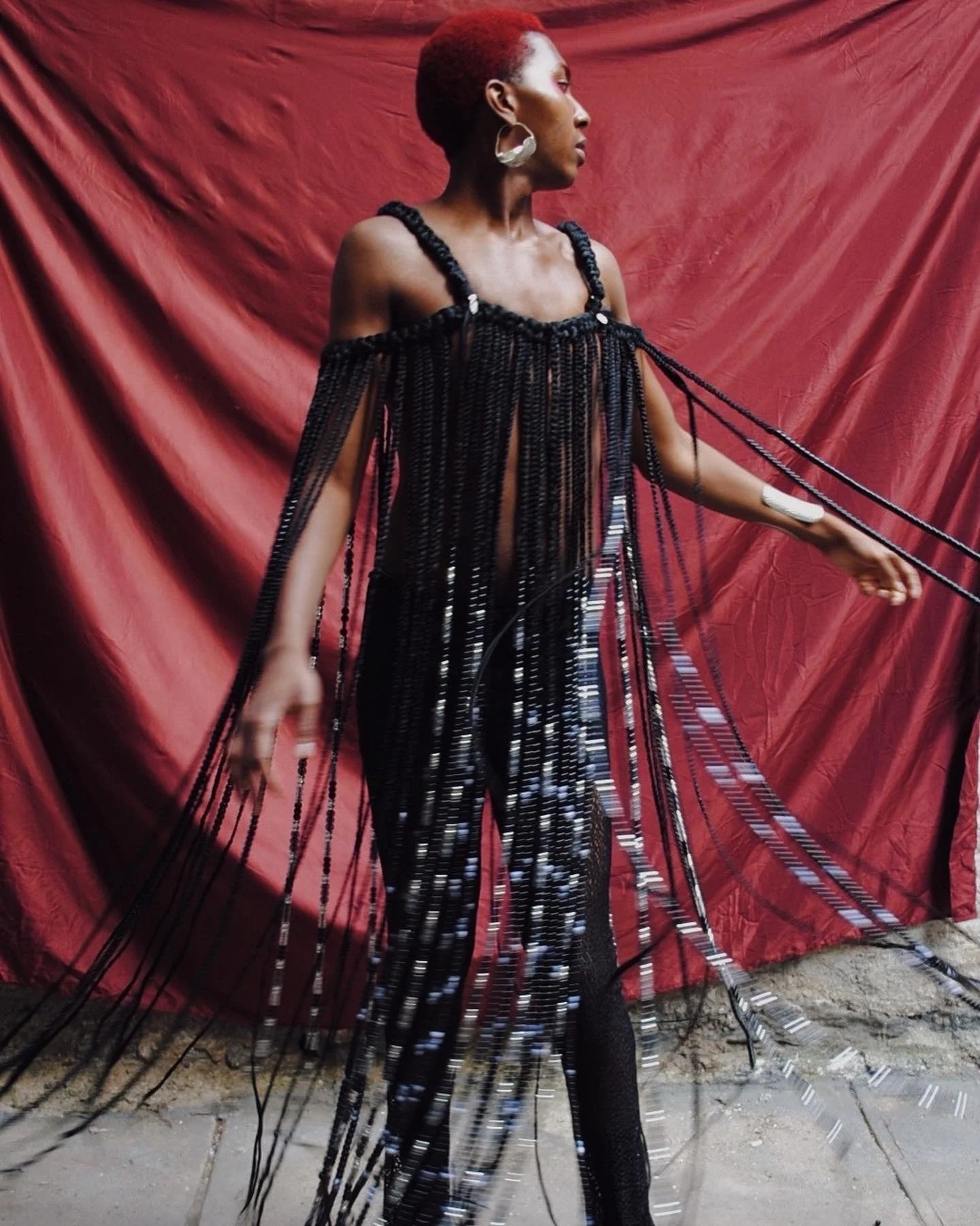 Third piece of the Legacy sound/sculptural suit and photo series. Exploring indigo’s spiritual and historical significance in Mali and studying the winged like braids of the Afar tribe of Ethiopia.